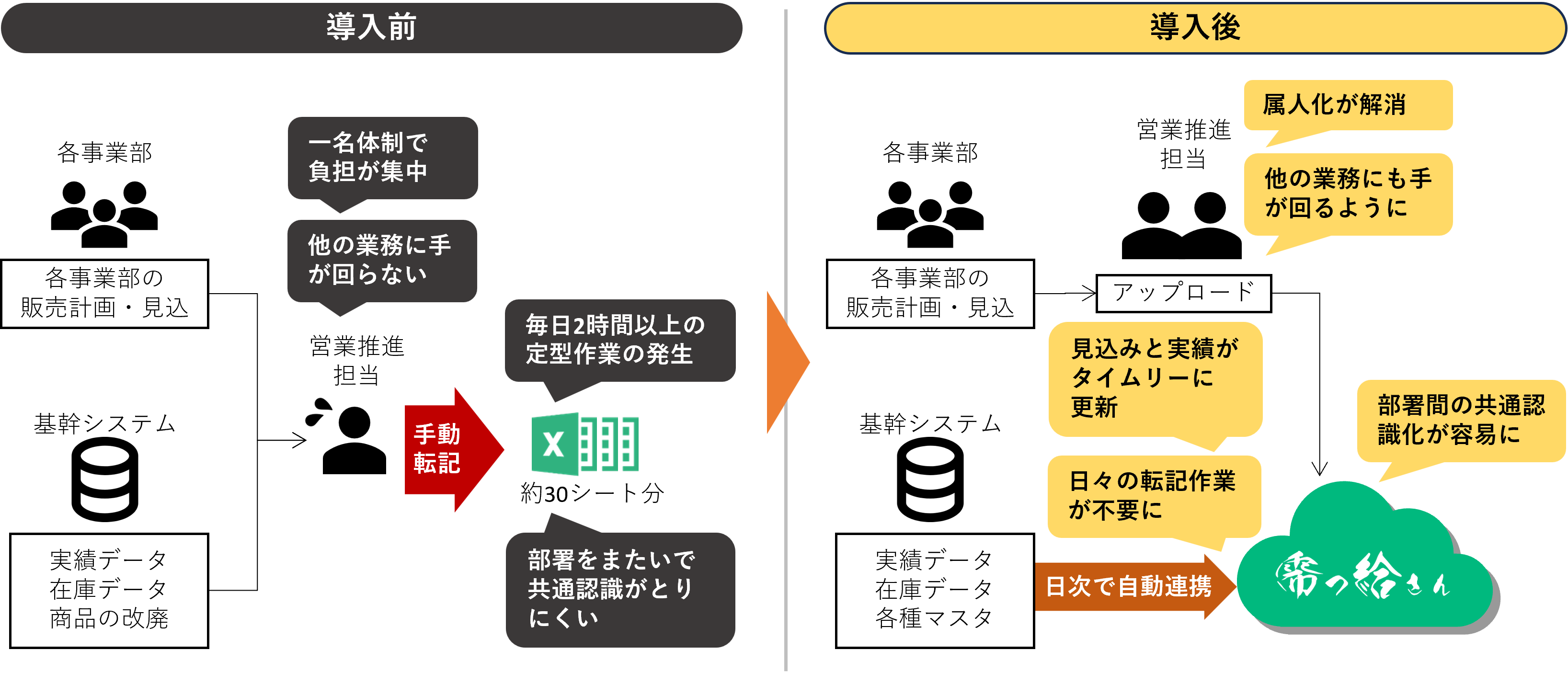 (大島様)活用させていただいています。以前はExcelでの運用で担当者への属人化が生じていました。また、明確なルールもあるようでなかったため、担当者が都度Excel上のデータを最新化するという状況でしたが、現在は「いつまでに見込みを提出する」といったルールが整備され、効率的に運用できる体制になっています。